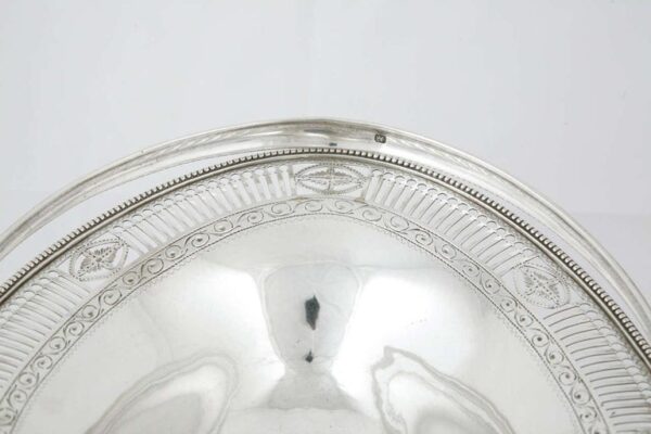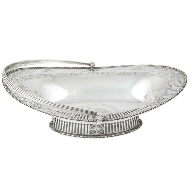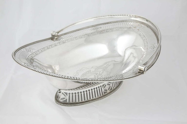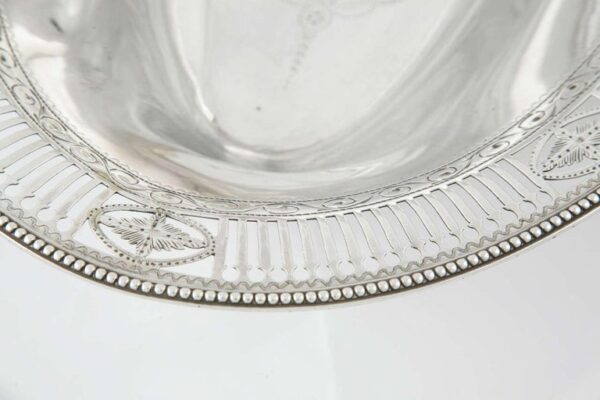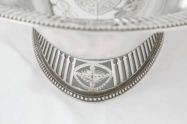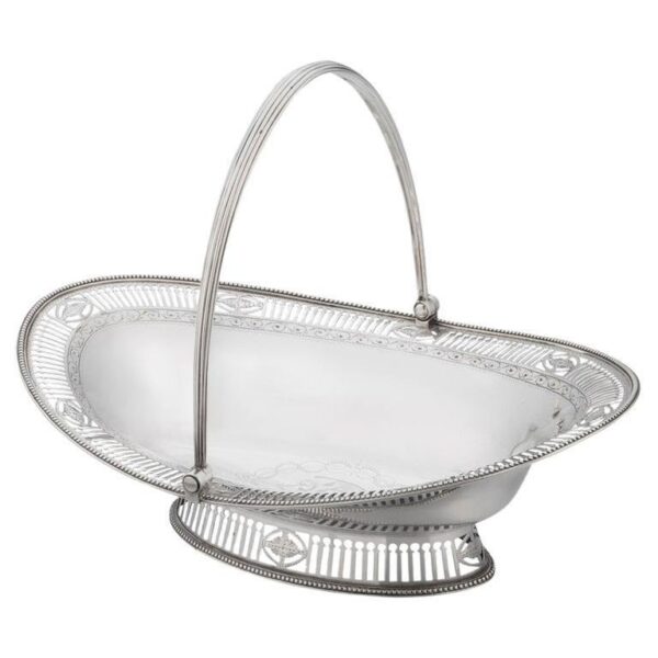 乔治三世纯银蛋糕篮由 Burrage Davenport 于 1783 年在伦敦制作。篮子是经典的椭圆形,有珠边和雕刻穿孔的长廊及底部。篮子中央还有一个原创的纹章。篮子长 34 厘米,带手柄的高度为 25.5 厘米。