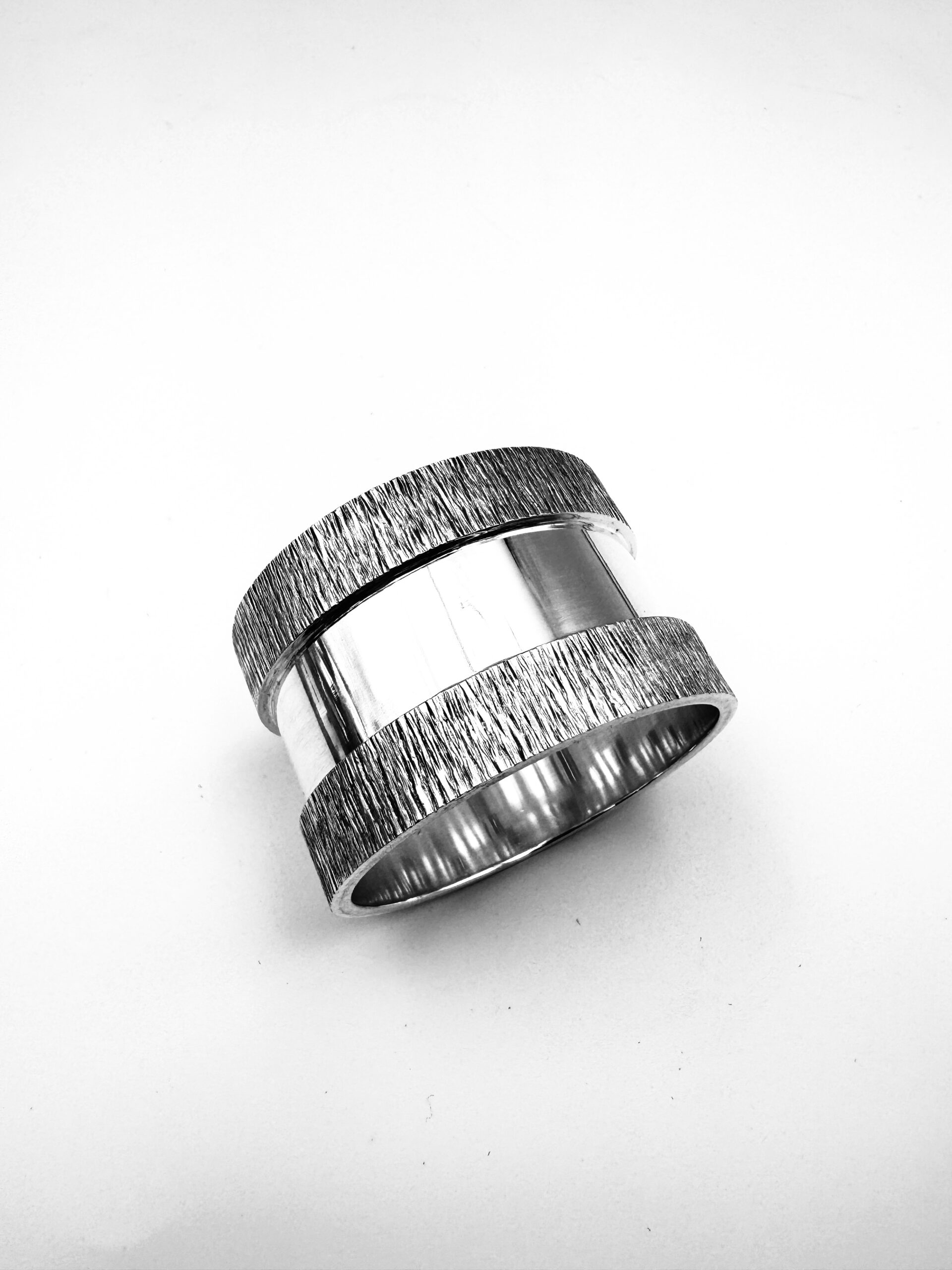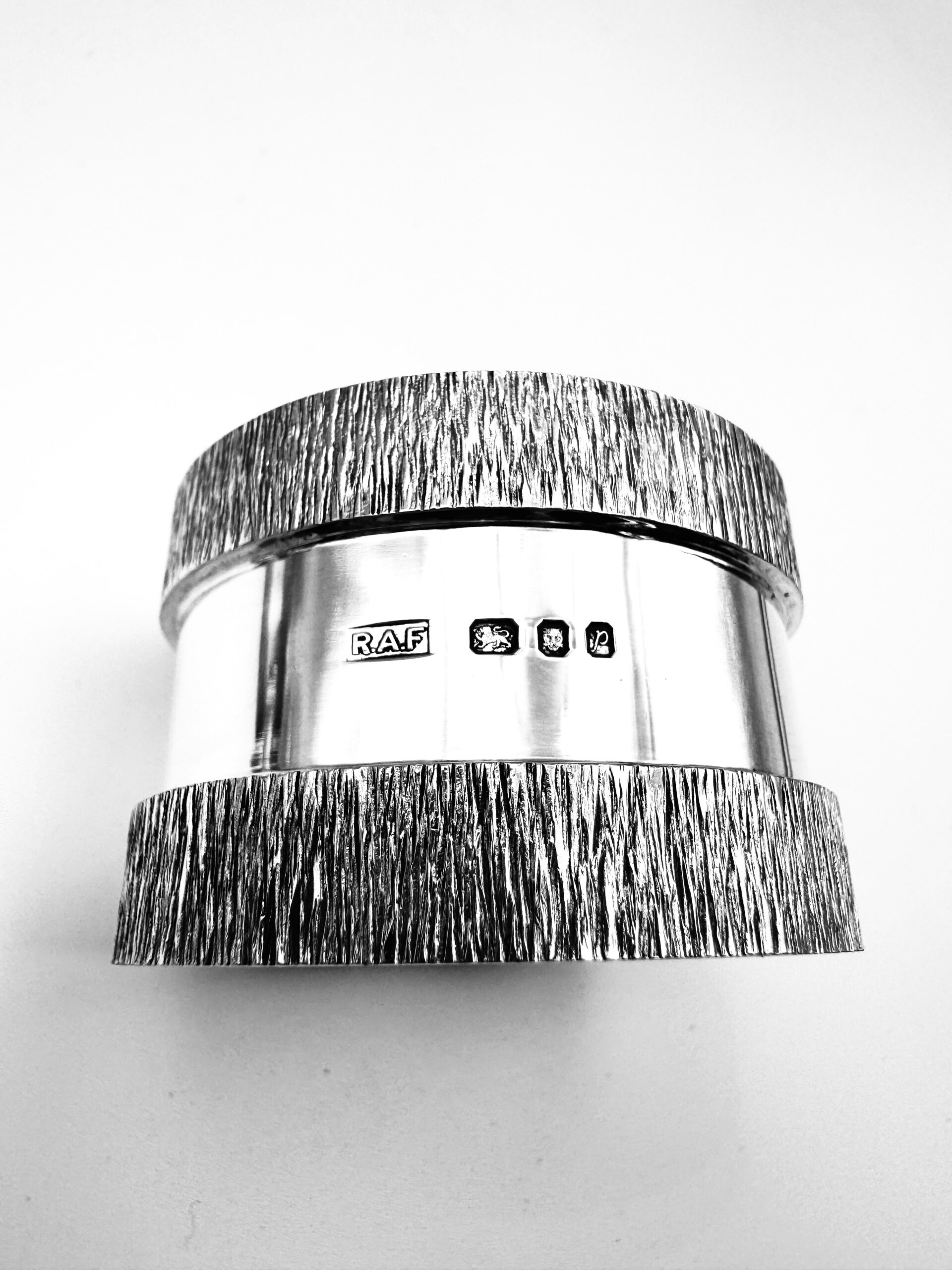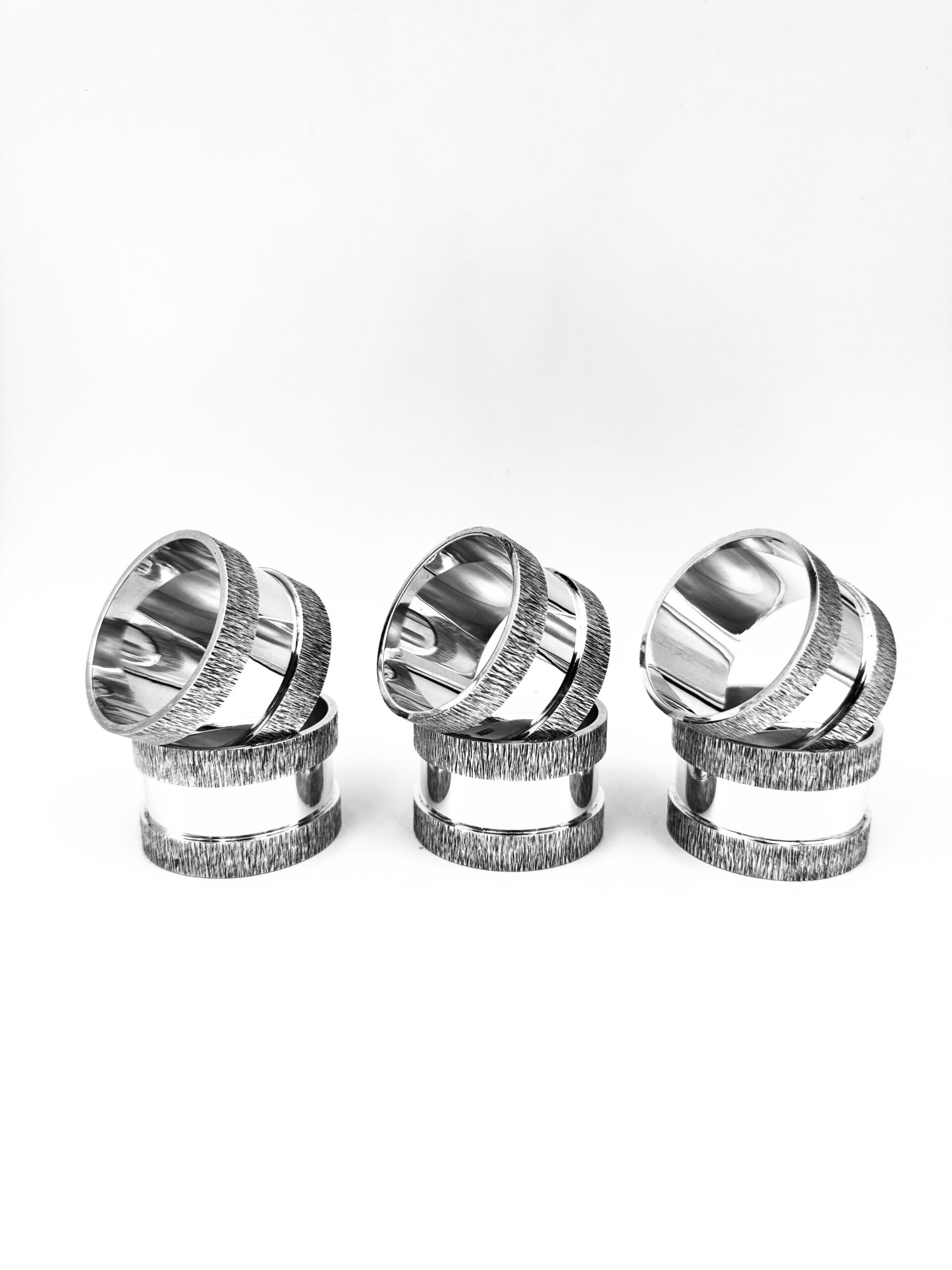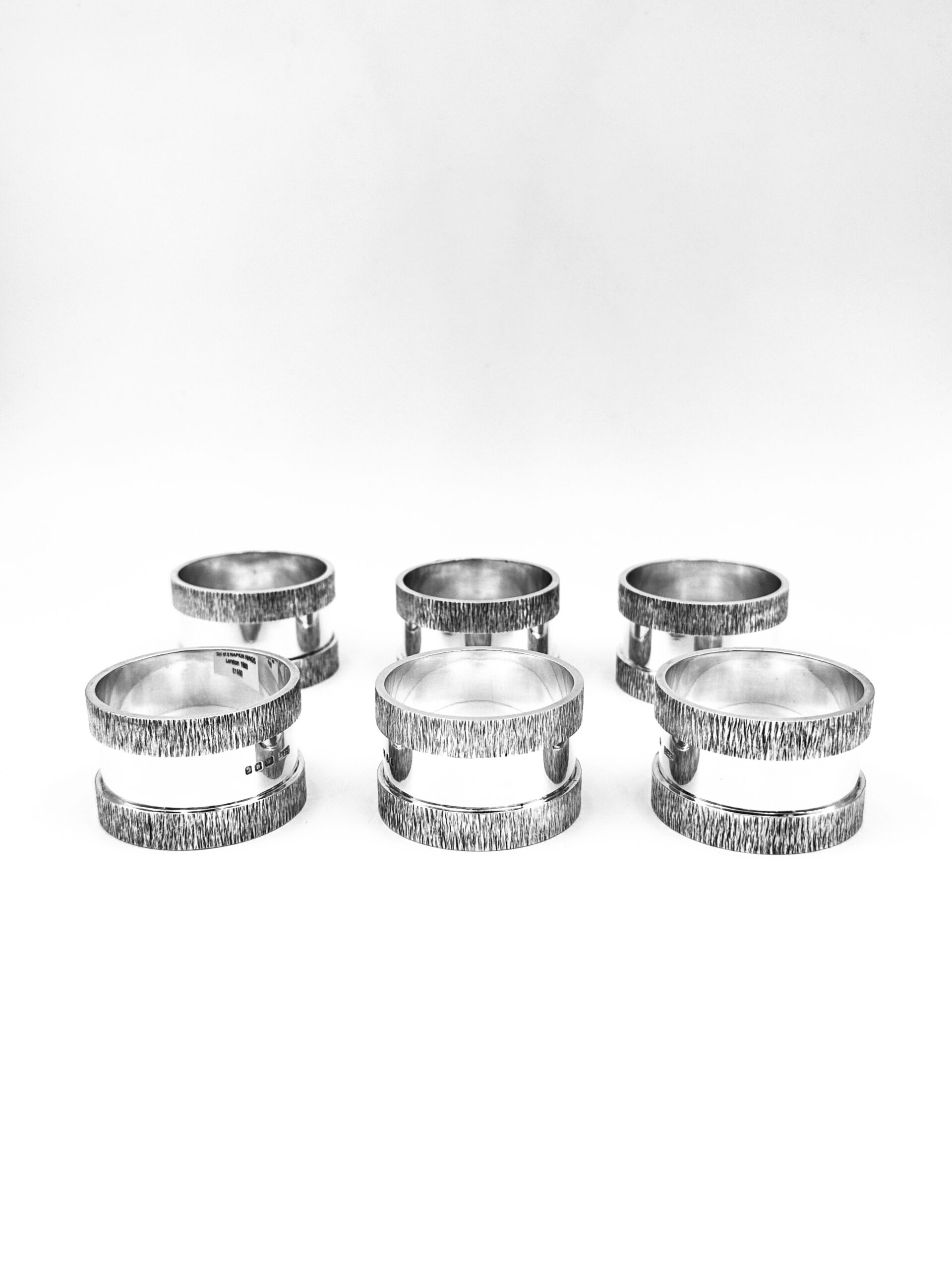 一套六枚银餐巾环,1989 年伦敦制造。中央为抛光带,边缘为拉丝纹理部分。